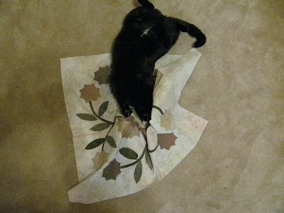 That afternoon I noticed the new can of spray starch sitting on the kitchen counter. I wondered how it had gotten back in the kitchen. A little later Peter came in the kitchen and asked me where the bug spray was. No, I thought, I didn't do that - did I? I ran out to the studio and there on the ironing board was a can of Raid! Do you think this might be a new technique- a bug free way to applique?