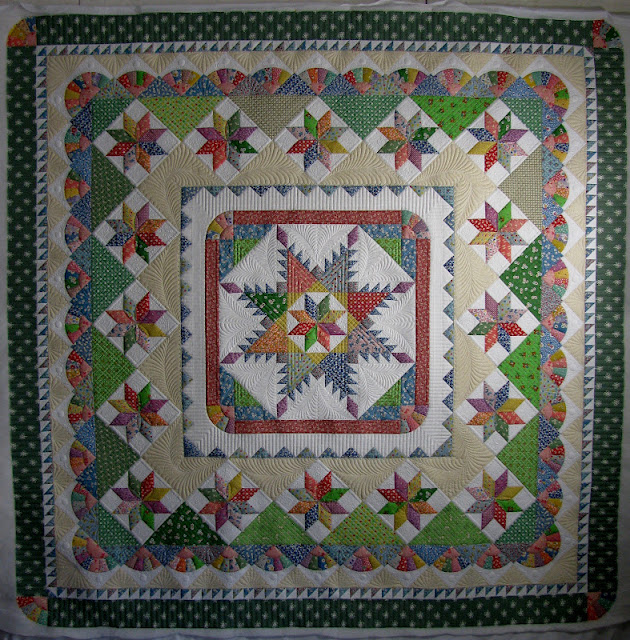 Cheryl requested no flowers, leaves, hearts, puppies or anything representational in the quilting of this wall hanging. I stuck to my trusty ruler for the most part. My incredible photographic skills have distorted the shape a bit.